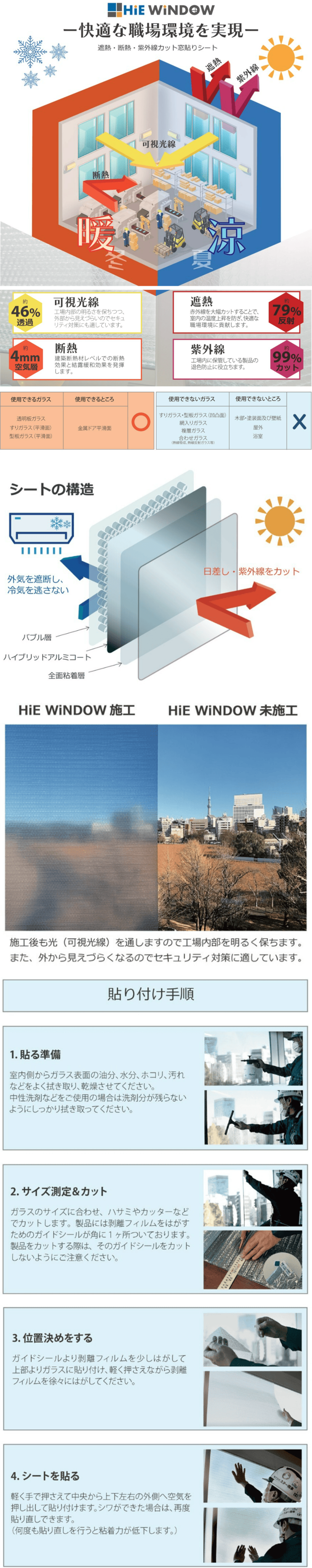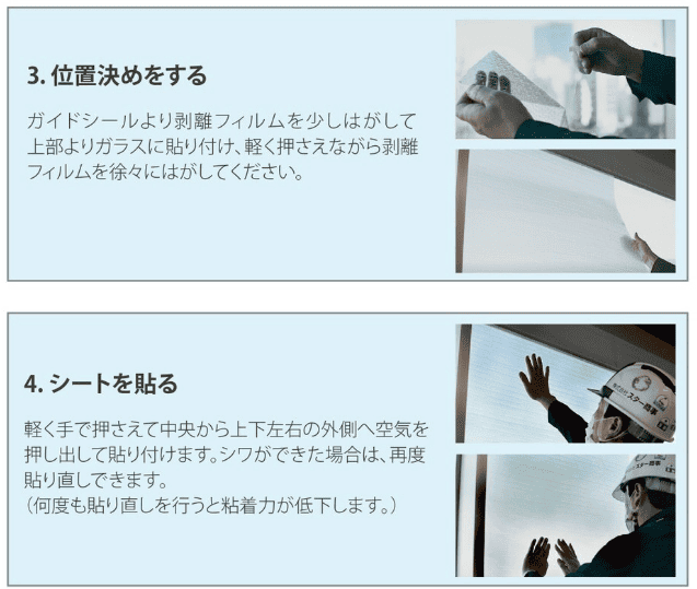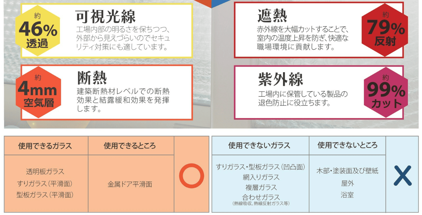 使用できないガラス:すりガラス(凹凸面)・型板ガラス(凹凸面)・網入りガラス